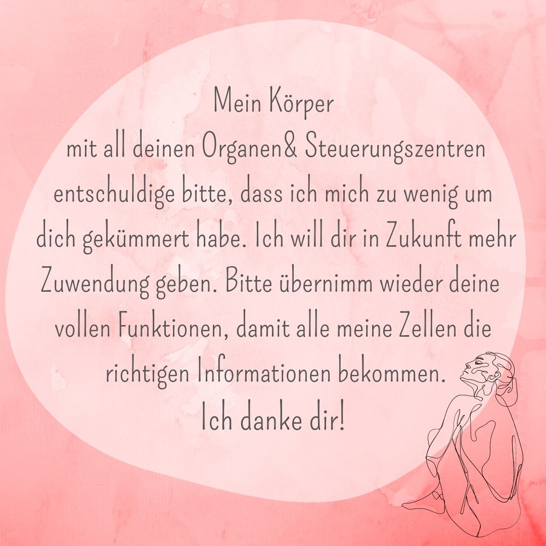 Mein Körper, bitte entschuldige, dass ich mich zu wenig um dich gekümmert habe. Ich verspreche dir mehr Aufmerksamkeit und Zuwendung.