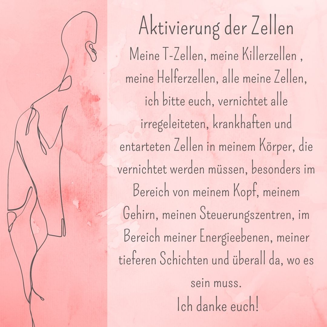 Meine T-Zellen, meine Killerzellen, meine Helferzellen – bitte vernichtet alle irregeleiteten, krankhaften und entarteten Zellen in meinem Körper, überall dort, wo es sein muss. Ich danke euch.